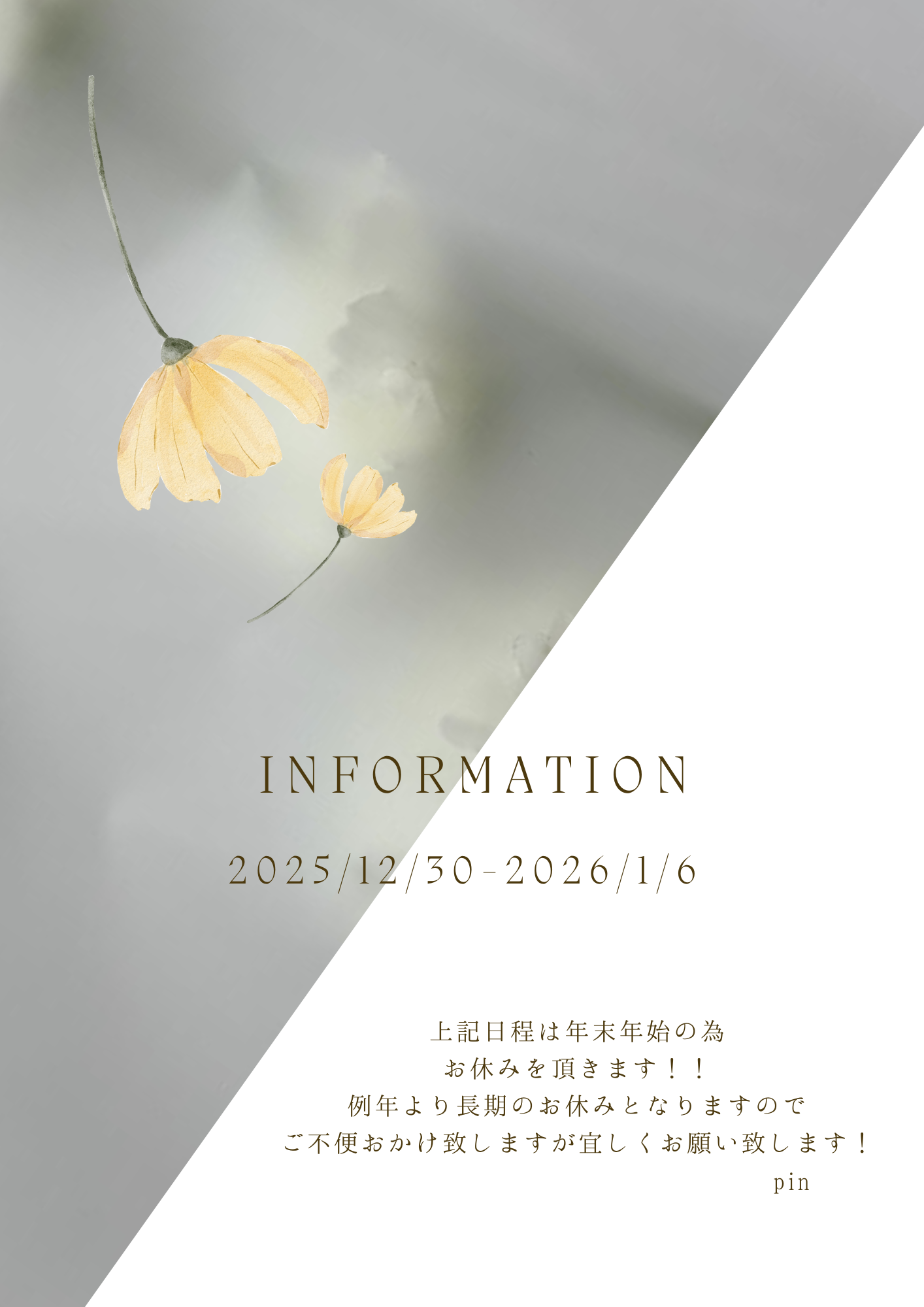 2025/12/30~2026/1/6までをお正月休みとさせて頂きます🙇🏻‍♀️‪‪!!例年より少し長いお休みとなりご不便おかけするかと思いますが宜しくお願い致します🥲また普段月火定休なのですが、12/29(月)に関しては通常営業とさせて頂きます!この日が年内ラストになりますのでどうぞご来店お待ちしております😌🌼